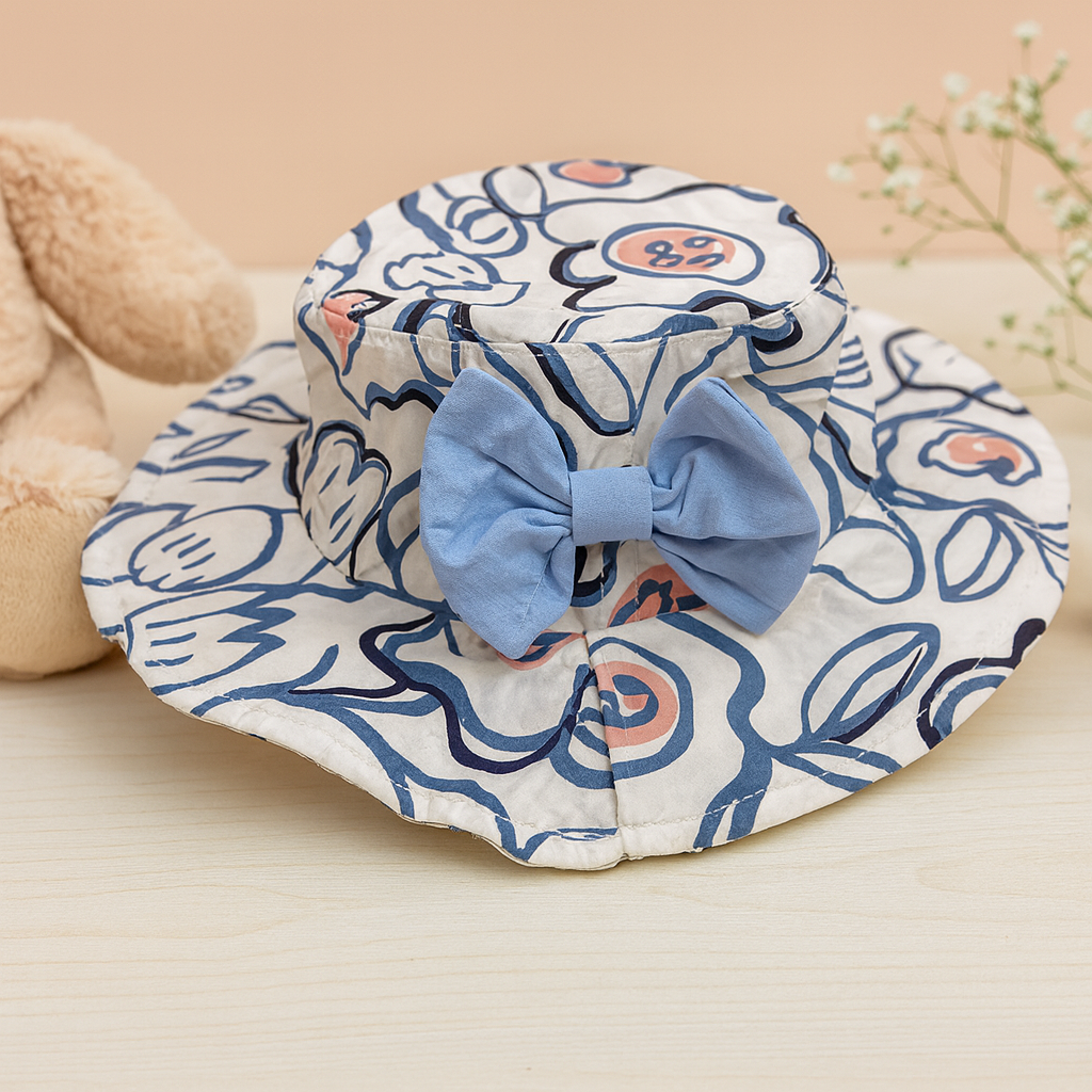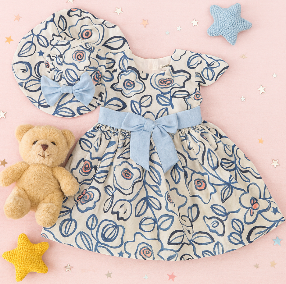 2‑piece floral dress and matching hat set for girls with a soft blue bow at the waist.