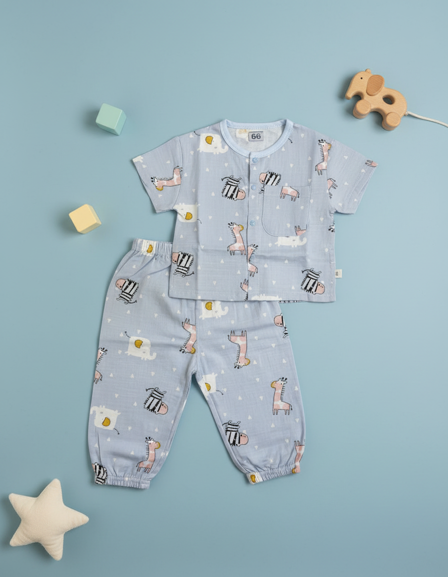 Drift into dreamland with this adorable half-sleeve and full-pant nightsuit, featuring playful giraffe and zebra prints on a soft, breathable fabric — perfect for your little explorer!