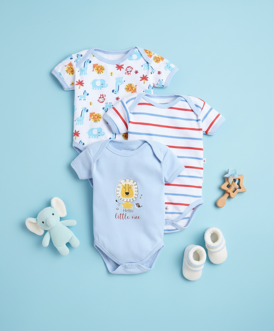 A comfy set of 3 100% cotton onesies featuring cute animal prints, stripes, and a sweet lion design.
