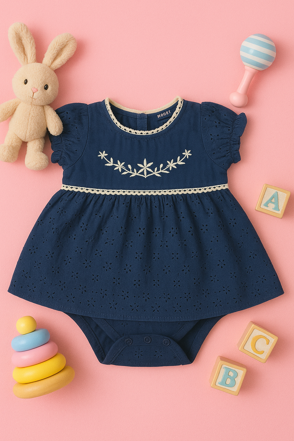 Navy frock‑style onesie with flutter sleeves and contrast lace. snap buttons at the bottom make it easy to change diapers