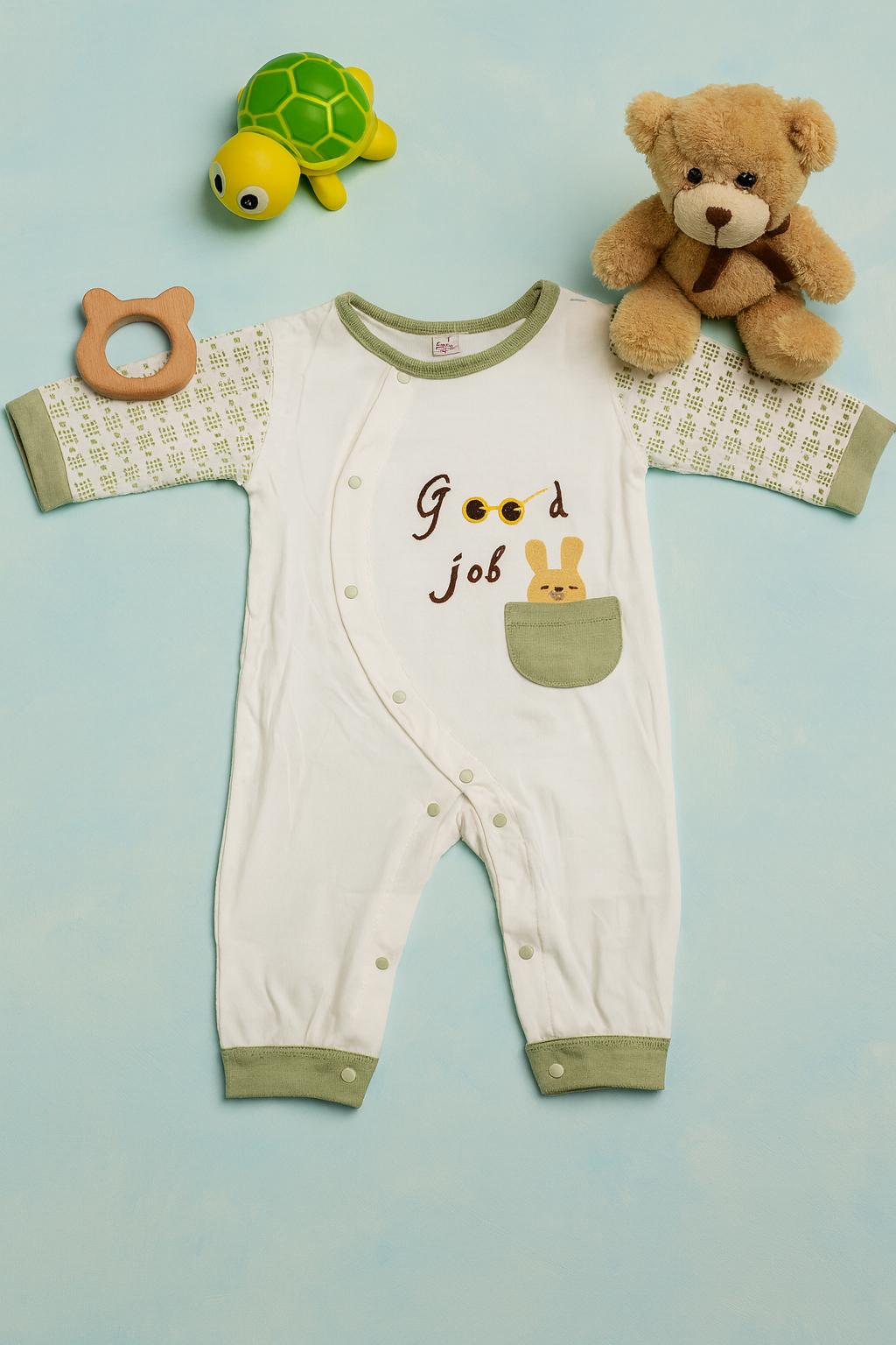 Green and white full‑sleeve romper with “Good job” bunny pocket print and side snap opening.