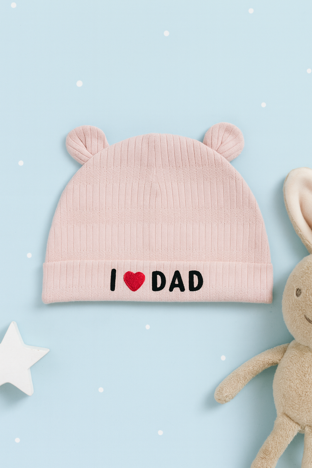 This soft pink set includes a cozy full‑sleeve romper with enclosed feet, a cute beanie cap, and a hooded swaddle, all with bold “I love Dad” prints for adorable matching photos.