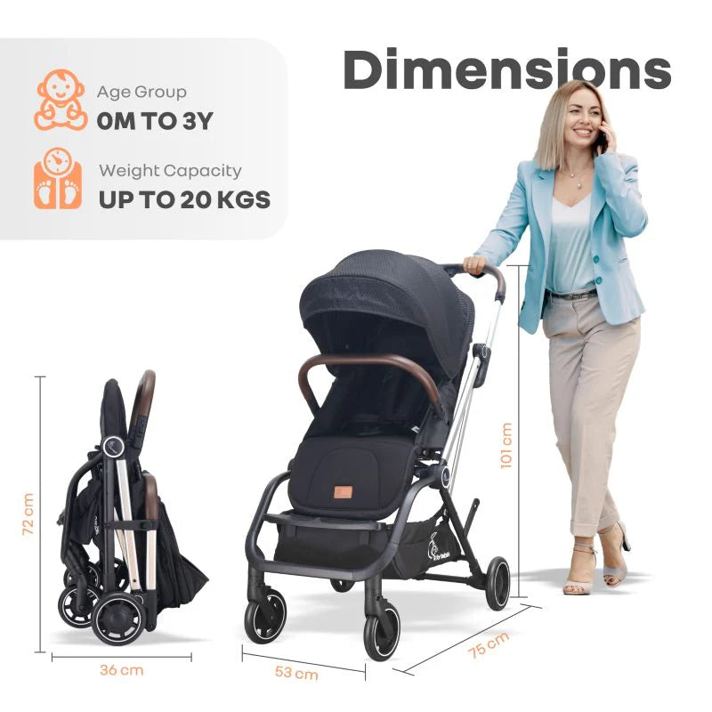 Strong Frame with Luxury Look: The Street Smart 360-degree stroller boasts a robust frame with a luxurious touch, combining durability and sophistication. Its premium fabric and stylish design add smart functionality and luxury.